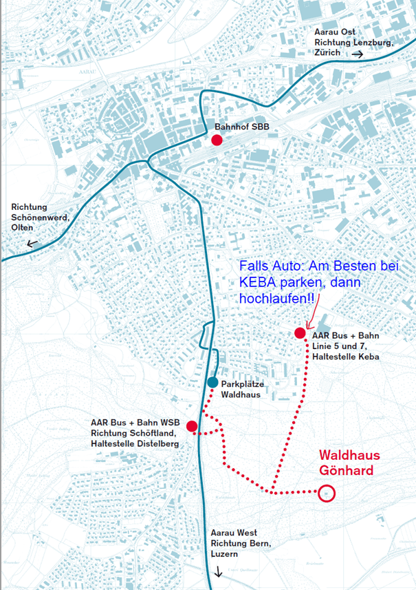 Es gibt Autoparkplätze bei der Kunsteisbahn KEBA und von da könnt ihr gemütlich einige Minuten zu Fuss zum Waldhaus Gönhard spazieren. Ansonsten ist ganz in der Nähe die ÖV-Haltestelle Distelberg. Zum Waldhaus Gönhard herrscht leider ein Fahrverbot.