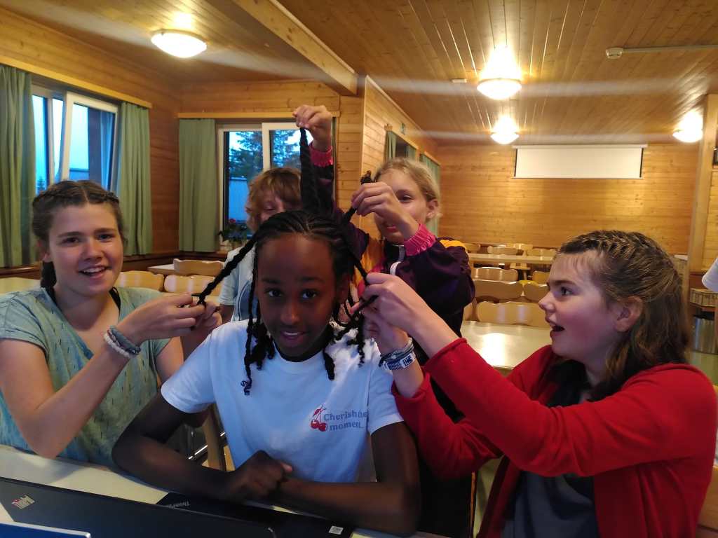 Dann mussten wir testen um nacher Mittag zuessen.Am Nachmittag gab es Workshops. Man konnte Werwolf spielen, t-shirts färben und Aerobic.